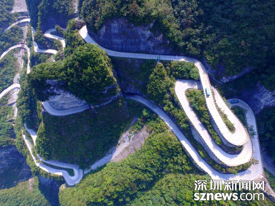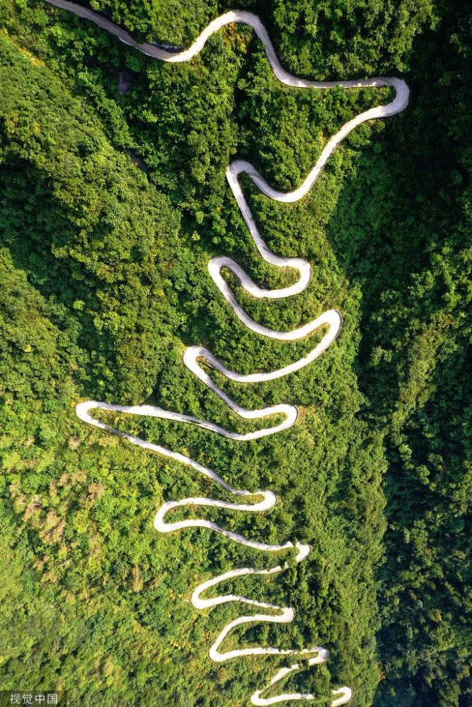 天門山盤山公路位于湖南省張家界市境內(nèi)的國家森林公園天門山上,盤山公路全長10.77公里,海拔從200米急劇提升到1300米,大道兩側(cè)絕壁千仞,空谷幽深,共計(jì)99個(gè)彎,180度急彎此消彼長,似玉帶環(huán)繞,航拍鏡頭下蜿蜒曲折的道路彎彎緊連,層層迭起,宛如迷宮般的“納斯卡線條”,被譽(yù)為“天下第一公路奇觀”,同時(shí)它也是世界上最危險(xiǎn)的十大公路之一。