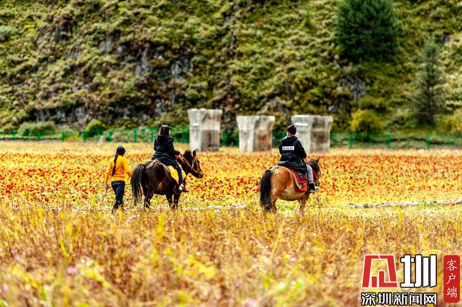 神奇的光線,無垠的草原,彎彎的小溪,金黃的柏楊,山巒連綿起伏,藏寨散落其間,牛羊安詳?shù)爻圆荨?/p>