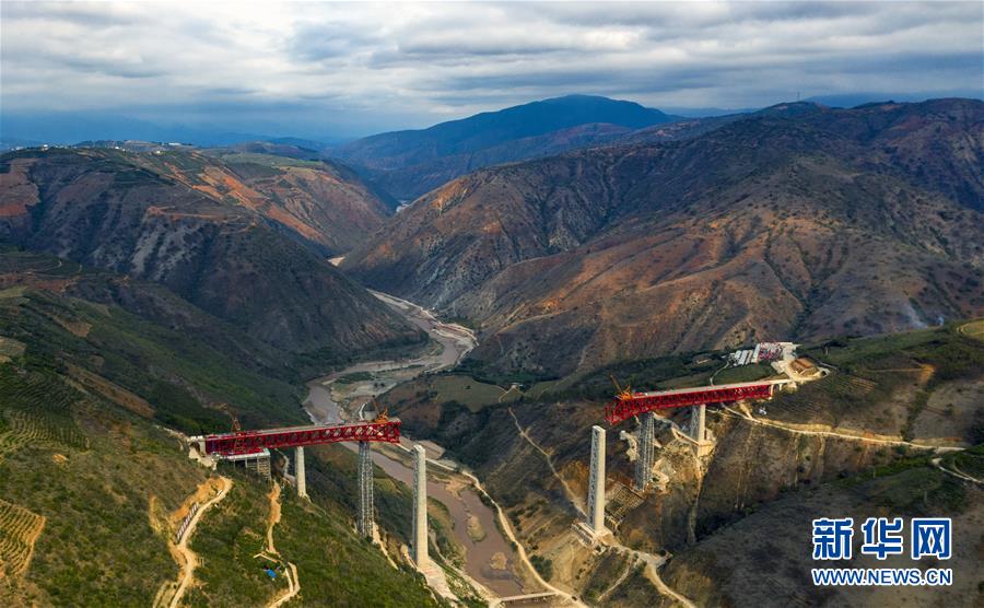 3月5日,空中俯瞰建設(shè)中的中老鐵路元江特大橋(無人機照片)。近期,中老鐵路玉溪至磨憨段有序復(fù)工復(fù)產(chǎn),由中鐵四局承建的中老鐵路全線重點控制性工程——元江特大橋、南溪河特大橋正在加緊施工建設(shè)。新華社記者 江文耀 攝