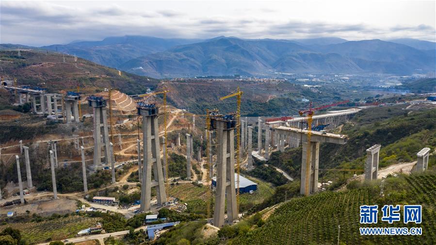 這是3月5日拍攝的中老鐵路南溪河特大橋橫跨在建高速公路(無(wú)人機(jī)照片)。近期,中老鐵路玉溪至磨憨段有序復(fù)工復(fù)產(chǎn),由中鐵四局承建的中老鐵路全線重點(diǎn)控制性工程——元江特大橋、南溪河特大橋正在加緊施工建設(shè)。新華社記者 江文耀 攝
