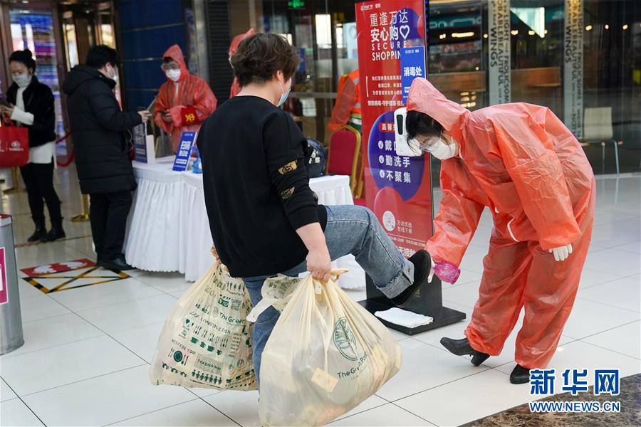 3月13日,在哈爾濱香坊萬達廣場內,工作人員在給進店顧客消毒。 近日,哈爾濱市多家大型商場陸續(xù)恢復營業(yè)。這些恢復營業(yè)的商場采取多種措施,從嚴細致做好疫情防控和安全風險防范工作,為廣大顧客提供安全放心的購物空間。 新華社記者 王建威 攝