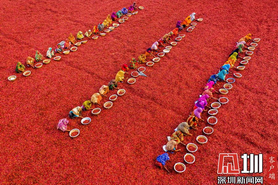 航拍孟加拉國工人分揀辣椒 滿眼火紅大地如鋪上地毯