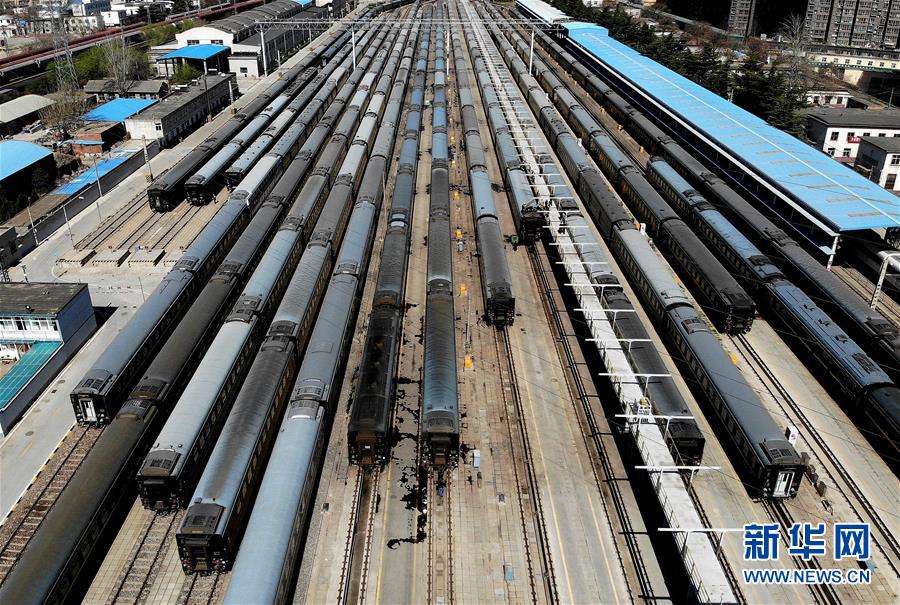 這是3月19日在鄭州車輛段鄭州客車整備所拍攝的準(zhǔn)備進(jìn)行春季整修的客車車體(無(wú)人機(jī)照片)。