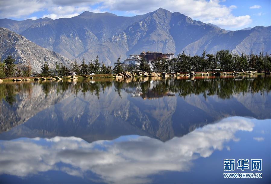 藍(lán)天白云和綠水之間的布達(dá)拉宮(6月5日攝)。新華社記者覺果攝