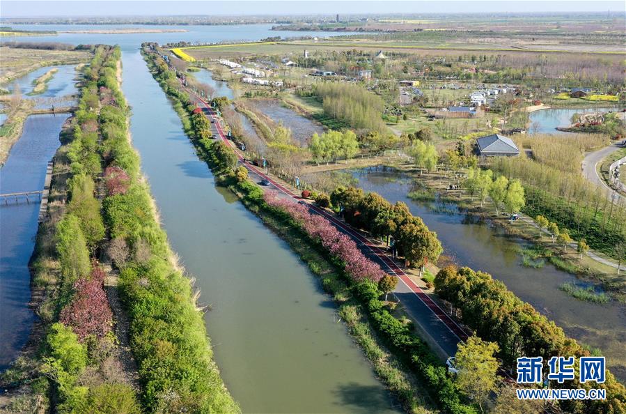 這是4月5日拍攝的白馬湖畔春日景象(無人機(jī)照片)。  新華社記者 楊磊 攝