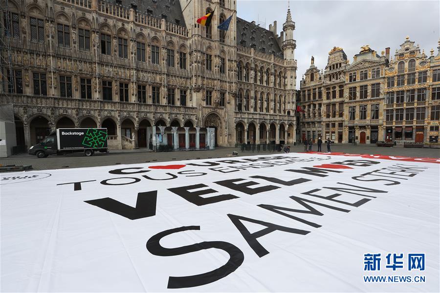 這是4月13日在比利時布魯塞爾大廣場拍攝的為抗擊疫情加油的巨幅海報(bào)。當(dāng)日,比利時布魯塞爾市政府工作人員在市中心的大廣場展開一面巨幅海報(bào),上面用法語和荷蘭語印著“一起鼓起勇氣”“謝謝”,以感謝市民及醫(yī)療人員為抗擊疫情所做的努力。新華社記者鄭煥松攝