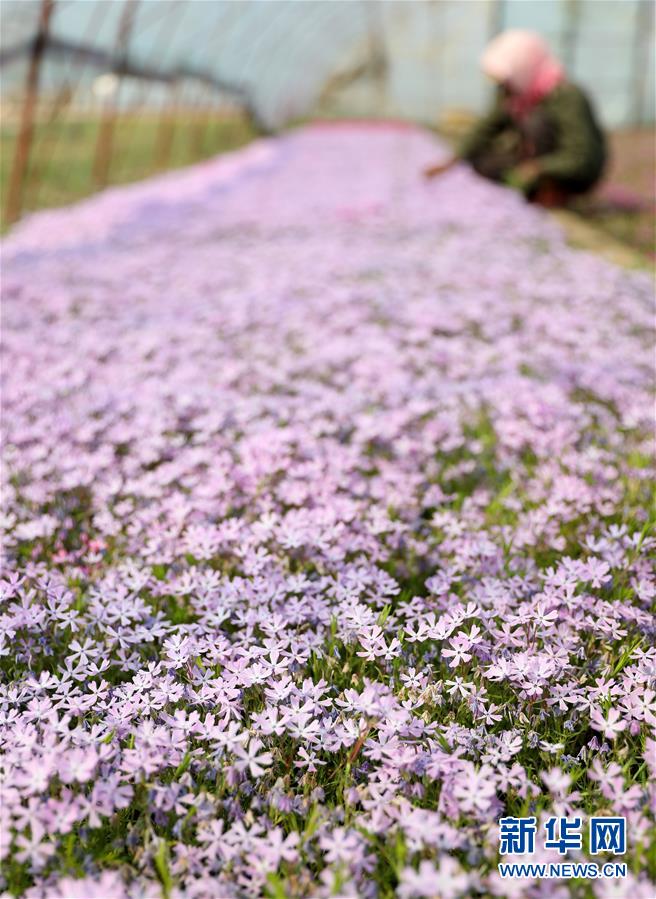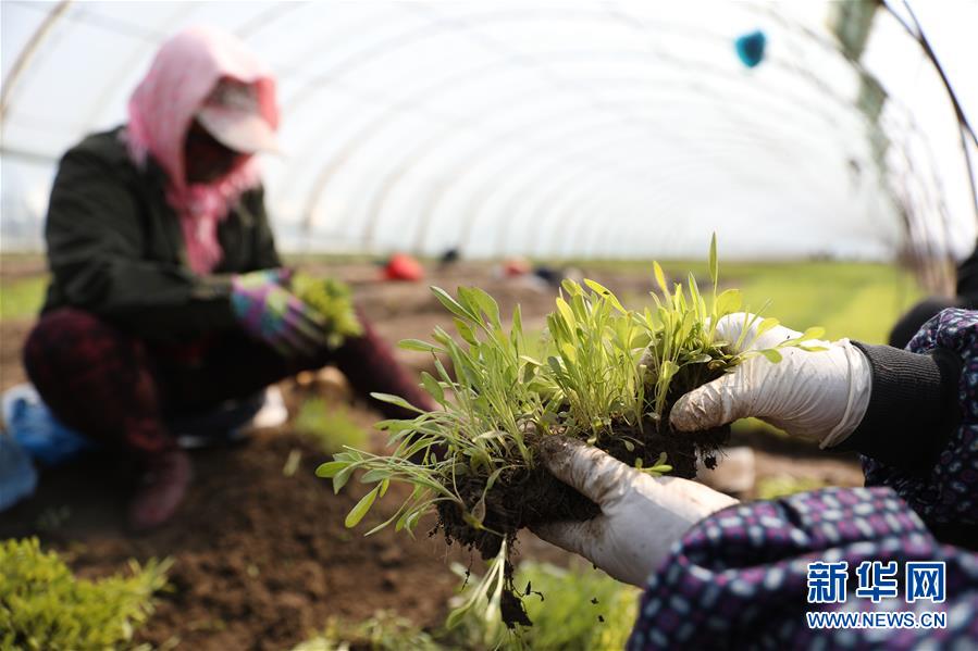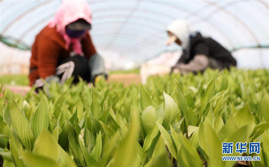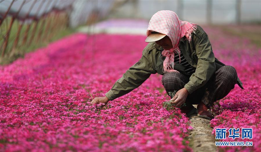 4月13日,花農(nóng)在八角臺街道雅化村一塊花圃內(nèi)分揀培育好的花苗。新華社記者姚劍鋒攝