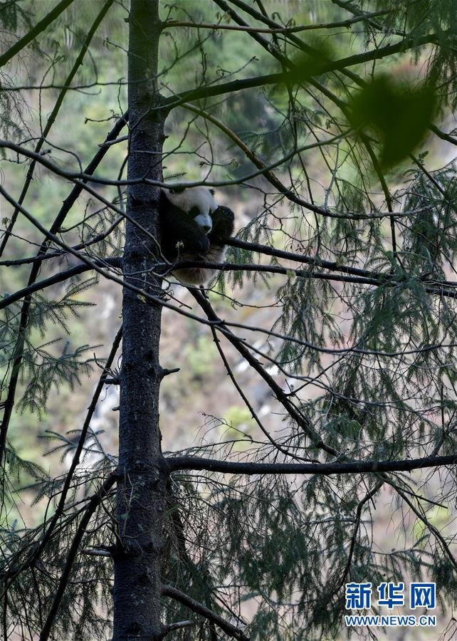 4月14日,大熊貓“喜妹”的幼崽在中國大熊貓保護(hù)研究中心核桃坪基地大熊貓戶外活動場的一棵大樹上休息。