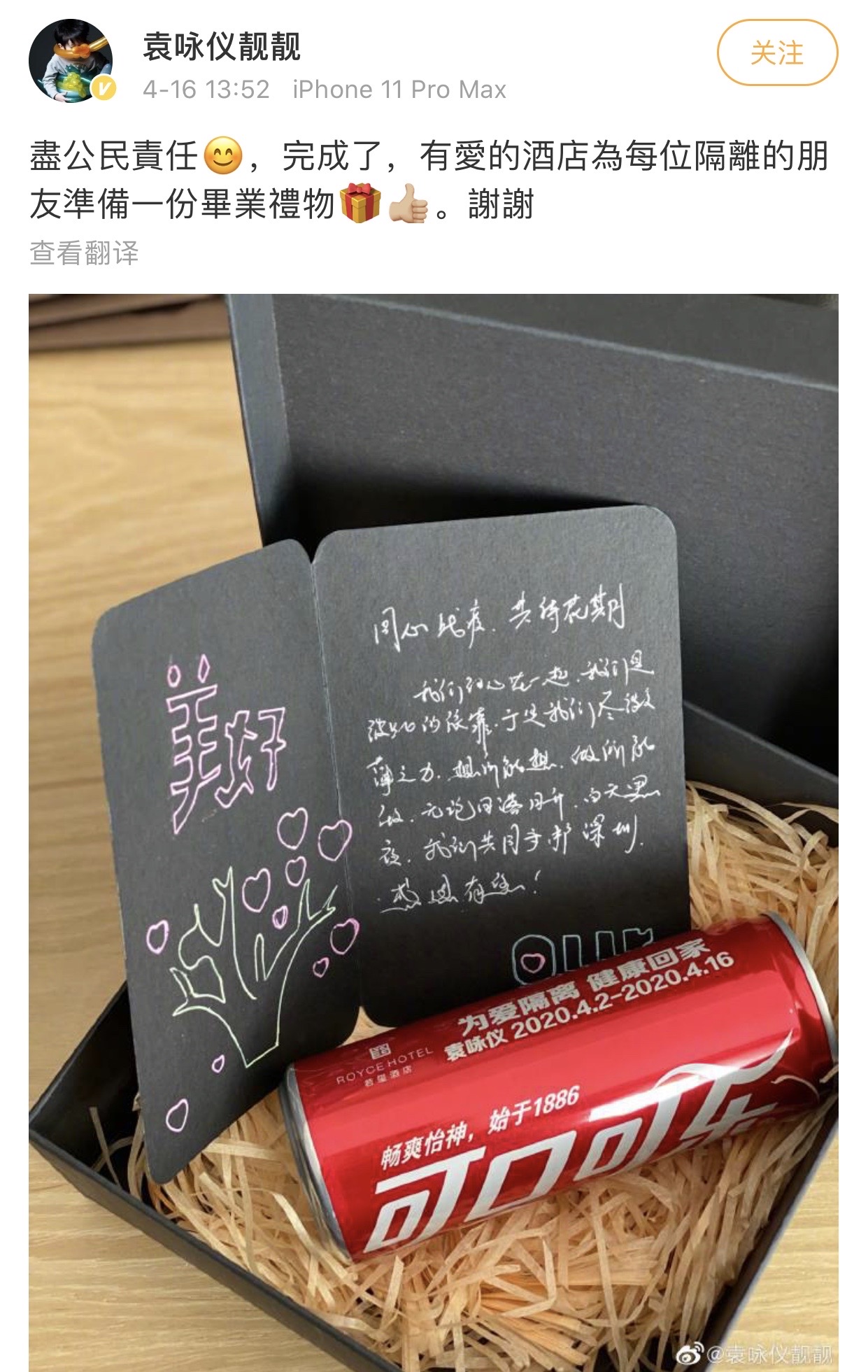 近日,香港藝人袁詠儀發(fā)了一條微博,曬出了一份特別的“畢業(yè)禮物”,這是深圳一酒店為每位結束隔離的公民準備的,除了有一瓶“為愛隔離、健康回家”的飲料,還有一張“同心戰(zhàn)疫、共待花期”的暖心賀卡。