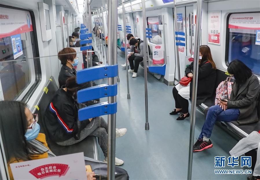 4月22日,在武漢軌道交通一號線上,乘客間隔一定距離坐在車廂里。為建立與經(jīng)濟社會發(fā)展和疫情防控需要相適應(yīng)的運輸服務(wù)保障機制,保障市民出行需求,從4月22日起,武漢城市公共交通有序恢復(fù)全線網(wǎng)運營。新華社記者沈伯韓攝