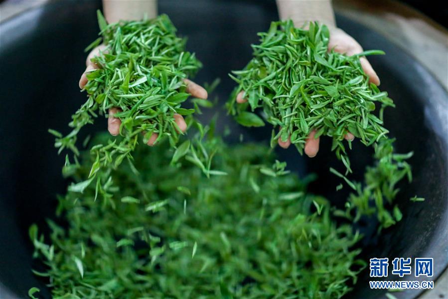 4月25日,工作人員在“扶貧茶園”內(nèi)制作綠茶。谷雨過后,在貴州省黔東南苗族侗族自治州丹寨縣“扶貧茶園”,茶農(nóng)搶抓農(nóng)時趕制春茶。丹寨縣創(chuàng)新產(chǎn)業(yè)扶貧模式,鼓勵社會公眾線上認(rèn)領(lǐng)茶園,再由茶園聘請當(dāng)?shù)刎毨魟?wù)工,為貧困戶創(chuàng)造茶園管理、采茶、制茶等就業(yè)機(jī)會,幫助貧困戶增收。今年以來,“扶貧茶園”已接受線上預(yù)訂600余畝,給當(dāng)?shù)?00余名村民提供了就業(yè)機(jī)會。新華社記者歐東衢攝