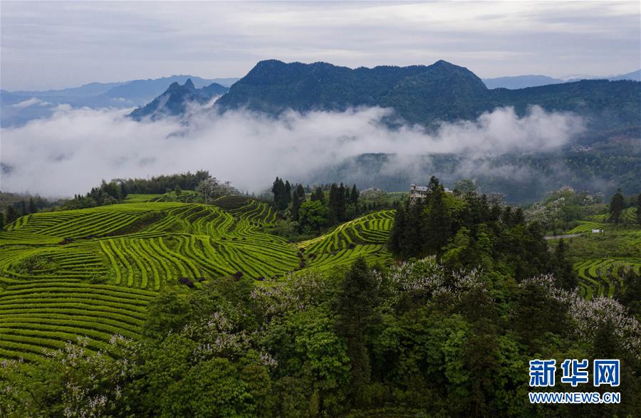 俯瞰鹿鳴茶海一角(4月28日無人機(jī)照片)。四川省珙縣的鹿鳴茶海,常年云霧繚繞,茶壟依山分布,美不勝收。新華社記者江宏景攝