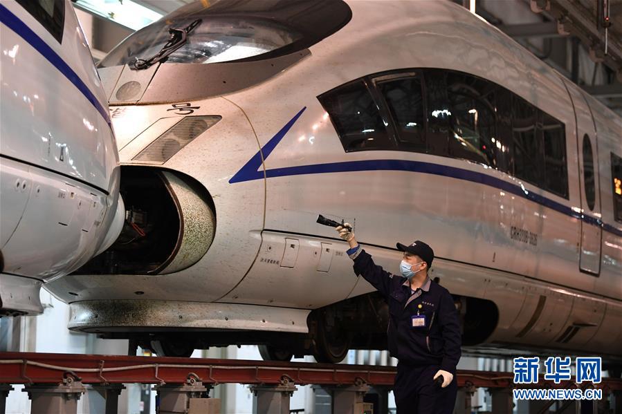 4月29日夜,合肥南動(dòng)車(chē)運(yùn)用所的工作人員對(duì)動(dòng)車(chē)組進(jìn)行檢修。每當(dāng)夜深人靜的時(shí)候,合肥南動(dòng)車(chē)運(yùn)用所卻燈火通明,“動(dòng)車(chē)安全守護(hù)者”們堅(jiān)守崗位,對(duì)動(dòng)車(chē)組進(jìn)行全面細(xì)致檢修。新華社記者 劉軍喜 攝