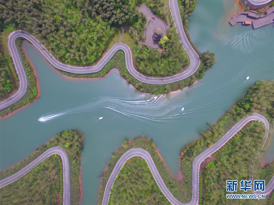 5月1日,在貴州省赤水市竹海國家森林公園里,游客乘坐快艇游覽竹海湖(無人機(jī)照片)。“五一”假日期間,人們以多種方式放松心情、享受假日。新華社發(fā)(張鵬攝)