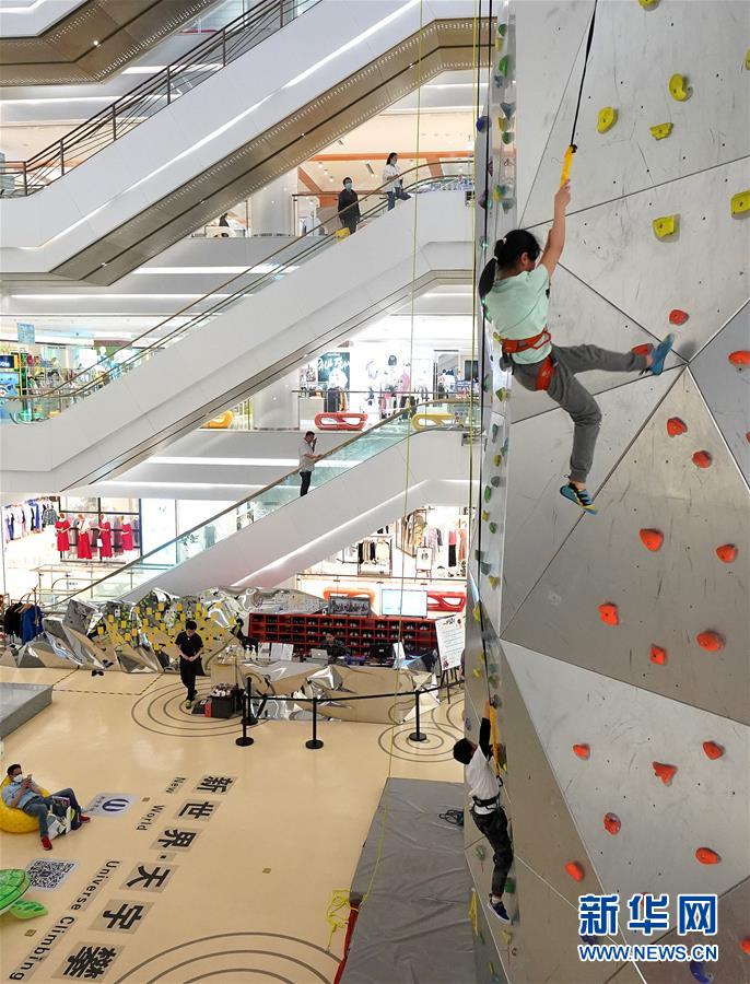 5月2日,小朋友在上海市南京路的一家百貨商場內(nèi)體驗(yàn)攀巖運(yùn)動(dòng)?!拔逡弧奔偃掌陂g,人們以多種方式放松心情、享受假日。新華社記者陳飛攝