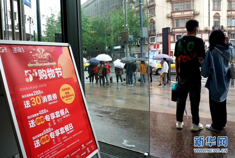 上海淮海路一家商場布置的“五五購物節(jié)”活動(dòng)信息(5月5日攝)。5月4日晚,上海首次啟動(dòng)大規(guī)模商業(yè)促銷活動(dòng)“五五購物節(jié)”,多家在線新經(jīng)濟(jì)企業(yè)參與,通過線上流量優(yōu)勢反哺線下賣場,實(shí)現(xiàn)電商與實(shí)體零售融合互動(dòng),激活消費(fèi)潛力、驅(qū)動(dòng)消費(fèi)復(fù)蘇。據(jù)“上海發(fā)布”的消息,截至5日14時(shí)12分,“五五購物節(jié)”上海地區(qū)消費(fèi)支付總額已超100億元。新華社記者劉穎攝