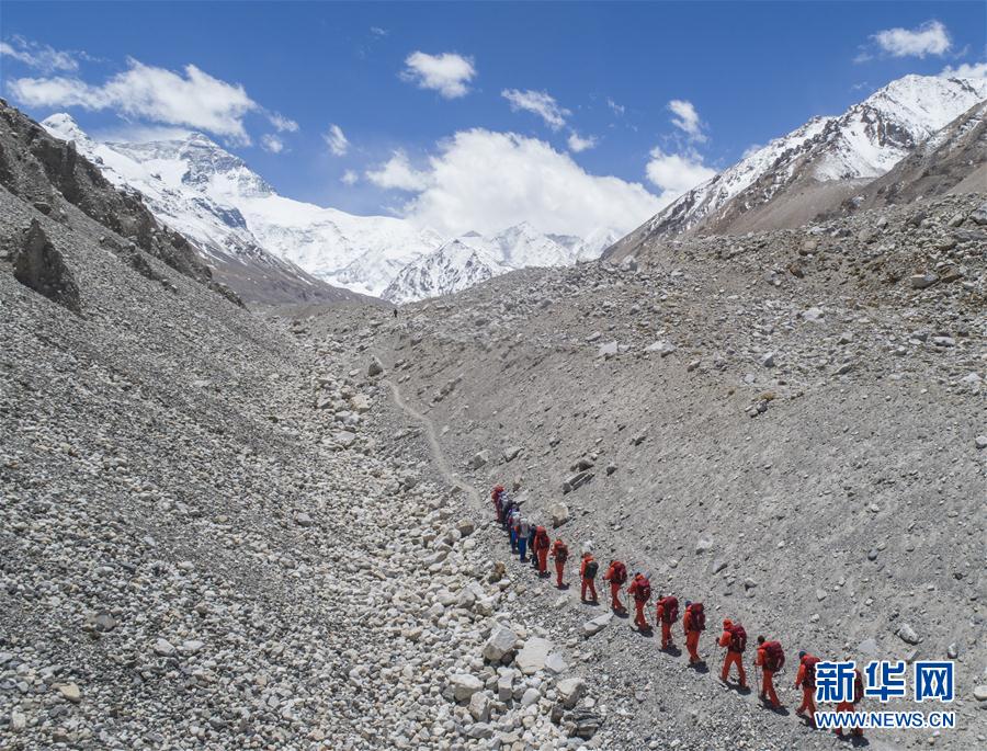 5月6日,登山隊(duì)員們向更高海拔進(jìn)發(fā)(無人機(jī)照片)。新華社記者孫非攝