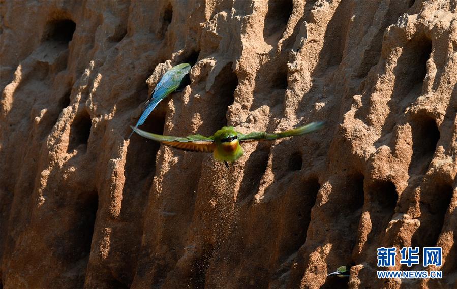 在海口五源河下游蜂虎保護小區(qū),栗喉蜂虎在沙質(zhì)土坡上起飛(5月7日攝)。新華社記者楊冠宇攝