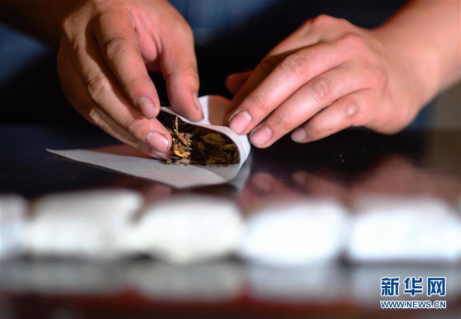 方舟在對新研發(fā)出的白雞冠茶用傳統(tǒng)綿紙進行緊壓包裝(5月10日攝)。新華社記者魏培全攝