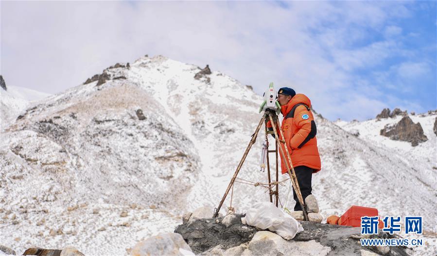 自然資源部第一大地測量隊(duì)隊(duì)員鄭林在使用全站儀對珠峰峰頂進(jìn)行交會(huì)觀測(5月27日攝)。新華社記者普布扎西攝