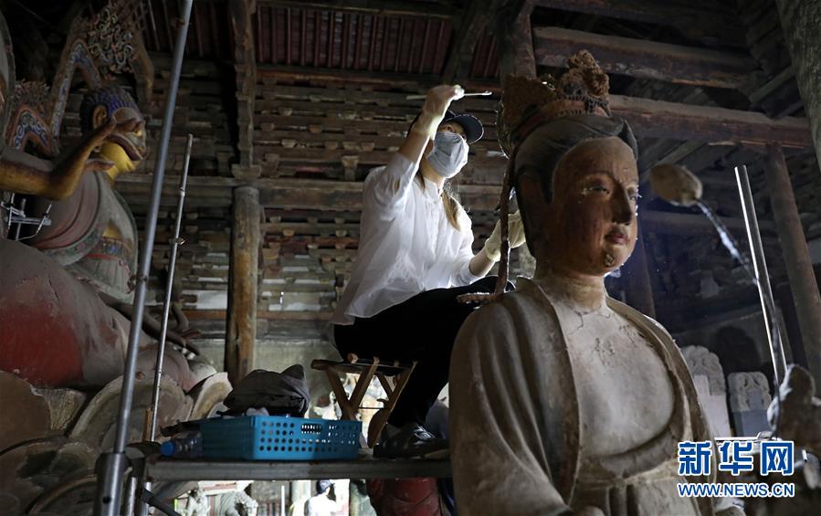 6月8日,工作人員對奉國寺的彩繪泥塑進(jìn)行保護(hù)修復(fù)。