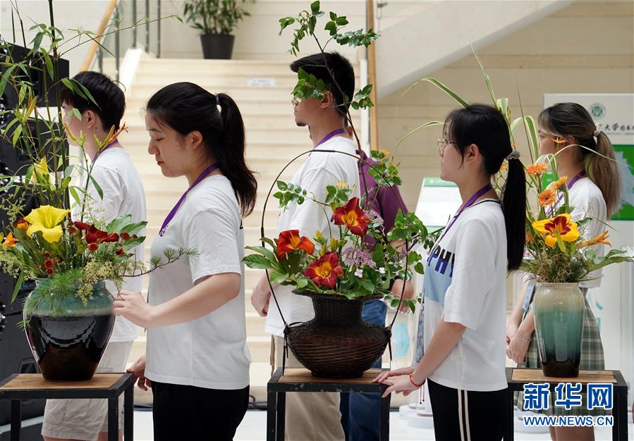 6月13日,上海應用技術(shù)大學的學生們設(shè)計創(chuàng)作的萱草花藝作品即將在開幕式現(xiàn)場亮相。當日,“2020中國(上海)萱草文化節(jié)”在上海應用技術(shù)大學開幕,校園里數(shù)百個品種的萱草花競相綻放,萱草科研推廣、萱草文化交流等多項活動同時舉行。新華社記者 劉穎 攝