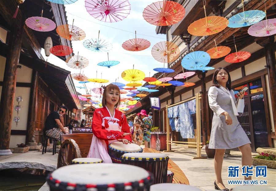 6月13日,在長春市世茂蓮花山小鎮(zhèn)寬厚里商街,表演者身穿漢服、古裝進(jìn)行表演展示。當(dāng)日是“文化和自然遺產(chǎn)日”。吉林長春首屆蓮花山消夏生活節(jié)在世茂蓮花山小鎮(zhèn)舉行?;顒訉⒎沁z展示與假日消暑休閑相結(jié)合,讓游人在“古色古香”的油紙傘巷中品傳統(tǒng)文化魅力,享夏日休閑愜意。新華社記者 許暢 攝