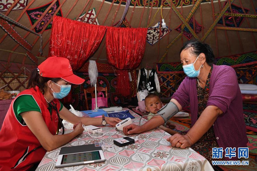 新疆布爾津縣也格孜托別鄉(xiāng)醫(yī)生布勒布勒古麗·金恩斯汗(左)給牧民檢查身體。新華社記者沙達(dá)提攝