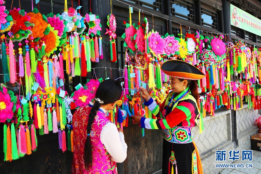 6月24日,繡娘胡蘭索卡在青海省互助土族自治縣舉辦的端午節(jié)香包“選美”大賽上展示她的作品。新華社記者解統(tǒng)強(qiáng)攝