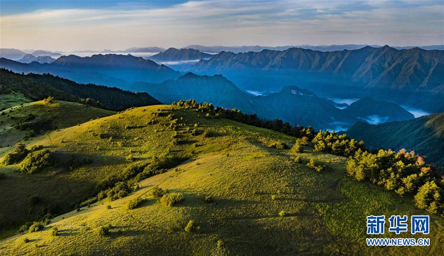 6月30日,朝霞照耀下的神田草甸(無(wú)人機(jī)照片)。位于陜西省安康市嵐皋縣與重慶市城口縣交界處大巴山神田主脊北坡的神田草甸,面積超過1.1萬(wàn)畝。夏日的朝霞中,起伏的草甸仿佛一塊寬大無(wú)邊的綠色地毯,鑲嵌在大巴山上,如詩(shī)如畫。新華社記者陶明攝