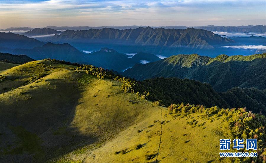 6月30日,朝霞照耀下的神田草甸與遠(yuǎn)處的群峰(無(wú)人機(jī)照片)。位于陜西省安康市嵐皋縣與重慶市城口縣交界處大巴山神田主脊北坡的神田草甸,面積超過(guò)1.1萬(wàn)畝。夏日的朝霞中,起伏的草甸仿佛一塊寬大無(wú)邊的綠色地毯,鑲嵌在大巴山上,如詩(shī)如畫。新華社記者陶明攝