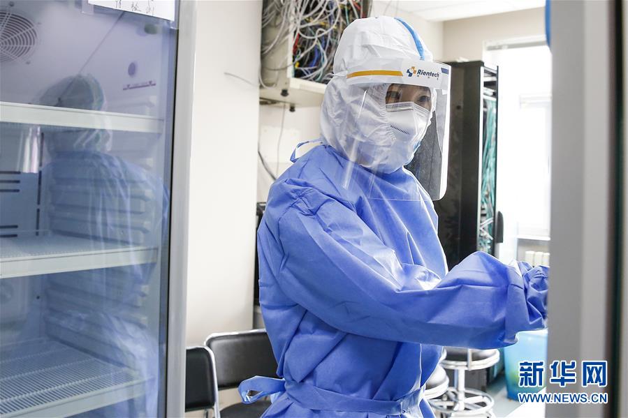 7月3日,中日友好醫(yī)院檢驗科新冠核酸檢測實驗室的檢驗人員閆克芹在進入污染區(qū)前穿戴防護裝備。新華社記者張玉薇攝
