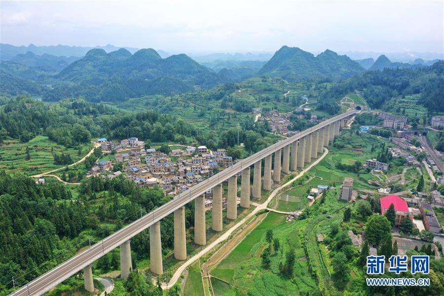 7月6日拍攝的安六鐵路岱港村特大橋(無人機照片)。當日,新建貴州安六鐵路(安順至六盤水)聯(lián)調(diào)聯(lián)試工作進入收尾階段,開通前的各項準備工作已基本就緒。安六鐵路線路全長約125公里,設(shè)計時速250公里,為國家I級雙線客運專線。建成投用后,貴陽至六盤水的鐵路旅行時間可從現(xiàn)在的3.5小時縮短為1小時左右,貴州省六盤水市將全面接入全國高鐵網(wǎng)。新華社記者劉續(xù)攝