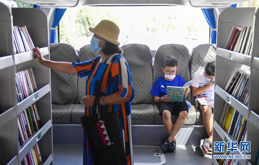 8月5日,小讀者在“流動圖書館”里看書。三千冊圖書,一輛大巴車,穿梭在城市的街頭巷尾。在吉林長春,長春市圖書館利用流動圖書車,定期在市內(nèi)15個固定服務點間巡回流動,為市民提供便捷的圖書借閱服務。新華社記者許暢攝