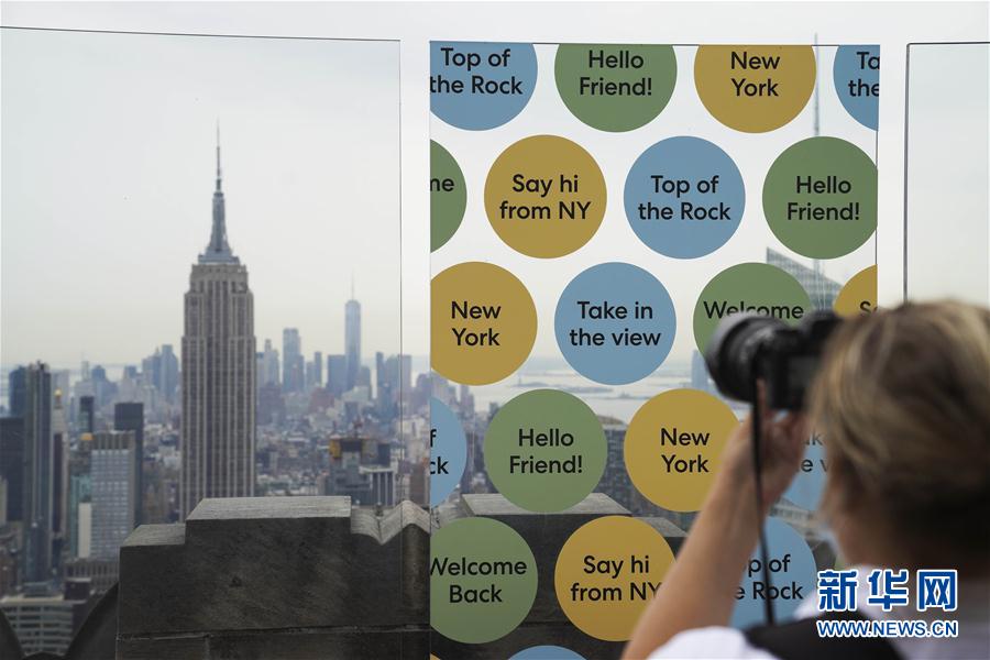 8月6日,在美國紐約,一名攝影師在洛克菲勒中心觀景臺上參觀。當(dāng)日,3月份暫時關(guān)閉的洛克菲勒中心觀景臺恢復(fù)對公眾開放。每天13時至21時,人們可戴口罩前往參觀。新華社記者王迎攝