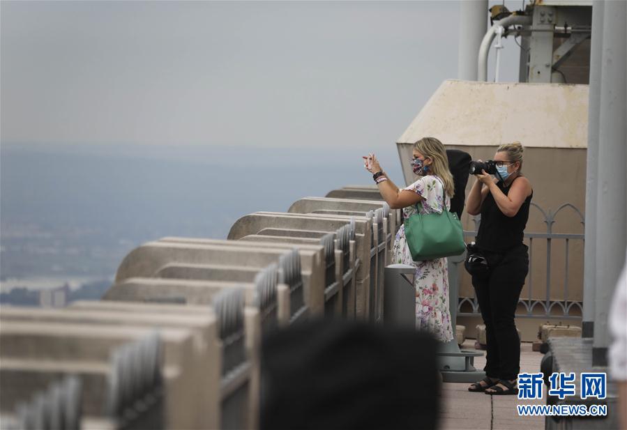 8月6日,在美國紐約,人們在洛克菲勒中心觀景臺上拍攝城市景觀。當日,3月份暫時關閉的洛克菲勒中心觀景臺恢復對公眾開放。每天13時至21時,人們可戴口罩前往參觀。新華社記者王迎攝