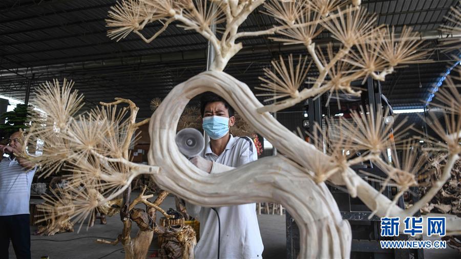 8月7日,工人在制作根雕工藝品。2017年以來,廣西桂林市永??h永安鄉(xiāng)通過幫扶返鄉(xiāng)青年創(chuàng)業(yè)的方式,建立起根雕工藝品就業(yè)扶貧車間,組織貧困群眾進車間務(wù)工學藝,把當?shù)刎S富的朽木和柑橘樹根枝資源利用起來,加工成盆景、茶桌、吊燈等根雕工藝品,不僅幫助貧困群眾在家門口掌握一技之長,還讓他們在脫貧摘帽后實現(xiàn)穩(wěn)定增收。新華社記者張愛林攝