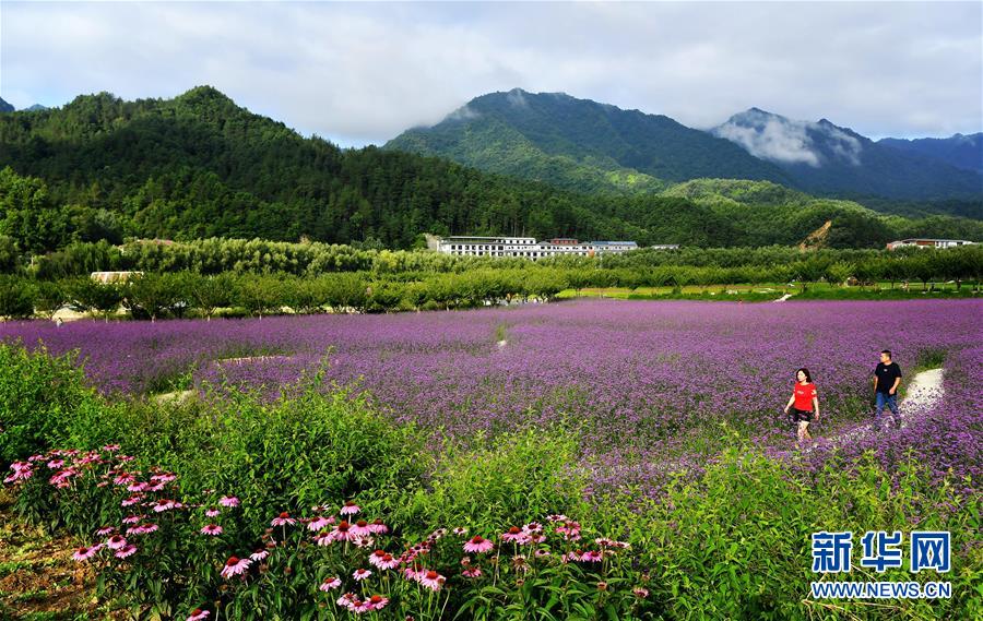 市民在位于陜西漢中市留壩縣城的金水灣花海散步(7月2日攝)。近年來,陜西地處秦巴山區(qū)的多個縣市結(jié)合當?shù)刈匀粴夂驐l件打造特色花海景觀,利用“花海經(jīng)濟”助力脫貧攻堅和鄉(xiāng)村振興。新華社記者劉瀟攝。