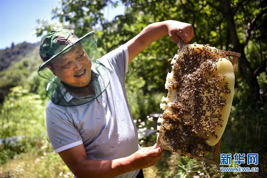 陜西漢中市留壩縣火燒店鎮(zhèn)天星亮村村民在展示扶貧社養(yǎng)殖的蜜蜂(7月2日攝)。秦嶺生態(tài)資源豐富,具有得天獨(dú)厚的蜜蜂養(yǎng)殖條件,但多年來山區(qū)農(nóng)戶自產(chǎn)自銷的模式收益甚少。近年來,多地采取“農(nóng)戶+合作社”模式,讓山區(qū)群眾養(yǎng)蜂增收有了保障。新華社記者劉瀟攝。