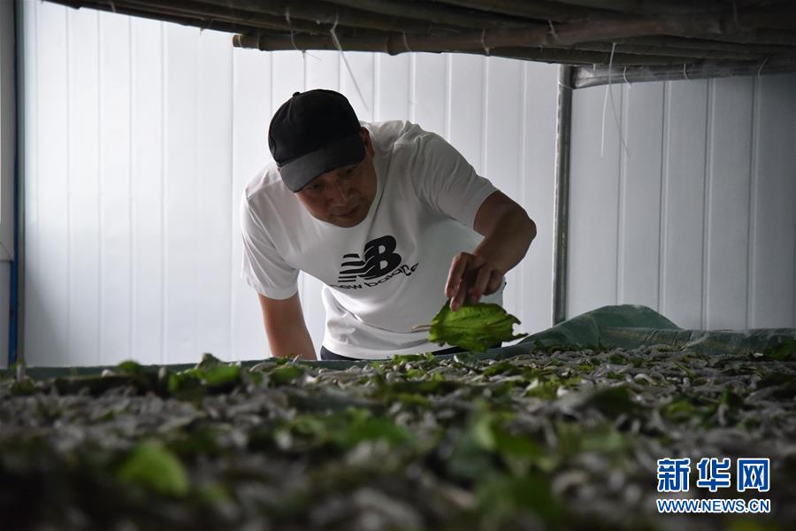 在貴州省畢節(jié)市納雍縣勺窩鎮(zhèn),納雍縣瑞慧桑蠶養(yǎng)殖發(fā)展有限責任公司負責人在查看桑蠶飼養(yǎng)情況(7月21日攝)。新華社記者駱飛攝。