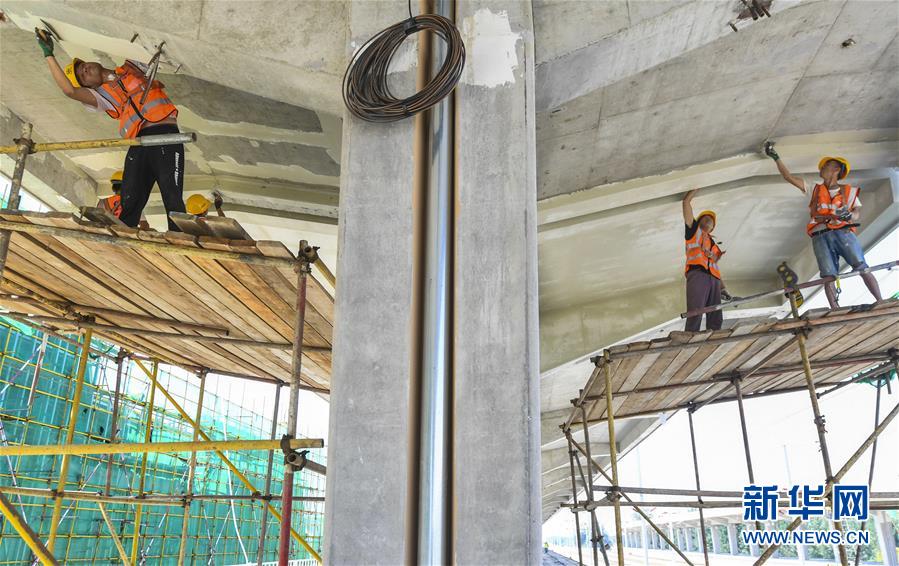 8月10日,工人在京雄城際鐵路霸州北站建設(shè)工地為雨棚梁底抹膩?zhàn)?。京雄城際鐵路霸州北站站臺雨棚混凝土結(jié)構(gòu)施工日前全部完成,目前霸州北站已全面轉(zhuǎn)入裝飾裝修和機(jī)電安裝階段,預(yù)計(jì)2020年底投入使用。京雄城際鐵路是連接北京市區(qū)、大興機(jī)場和雄安新區(qū)的重要干線。建成后,將進(jìn)一步完善京津冀區(qū)域高速鐵路網(wǎng)結(jié)構(gòu),便利沿線群眾出行,對于推動京津冀協(xié)同發(fā)展和支撐建設(shè)雄安新區(qū)具有重要意義。新華社記者李曉果攝。