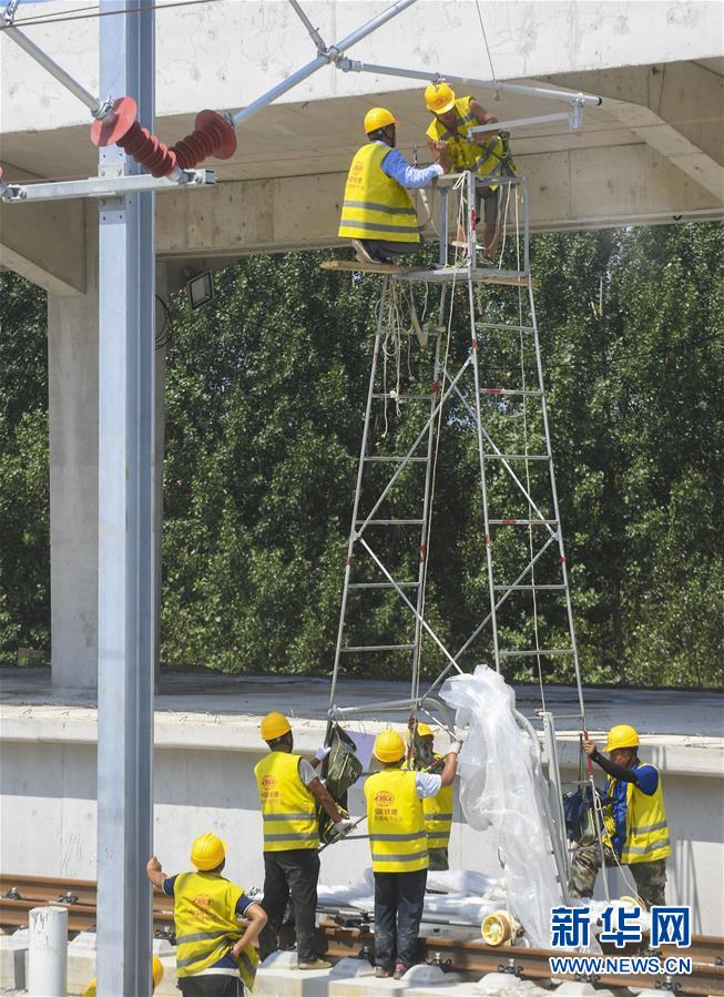 8月10日,工人在京雄城際鐵路霸州北站建設(shè)工地為接觸網(wǎng)卡定位。京雄城際鐵路霸州北站站臺雨棚混凝土結(jié)構(gòu)施工日前全部完成,目前霸州北站已全面轉(zhuǎn)入裝飾裝修和機(jī)電安裝階段,預(yù)計(jì)2020年底投入使用。京雄城際鐵路是連接北京市區(qū)、大興機(jī)場和雄安新區(qū)的重要干線。建成后,將進(jìn)一步完善京津冀區(qū)域高速鐵路網(wǎng)結(jié)構(gòu),便利沿線群眾出行,對于推動京津冀協(xié)同發(fā)展和支撐建設(shè)雄安新區(qū)具有重要意義。新華社記者李曉果攝。