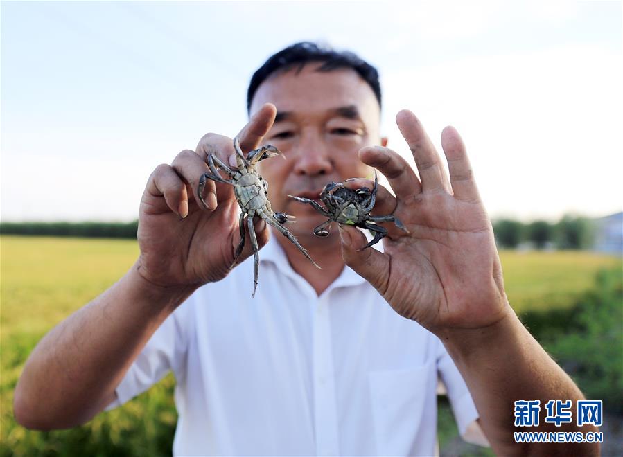 8月12日,春華村黨支部書(shū)記董為春展示從水稻田中捕撈的稻田蟹。新華社記者 雒圓 攝