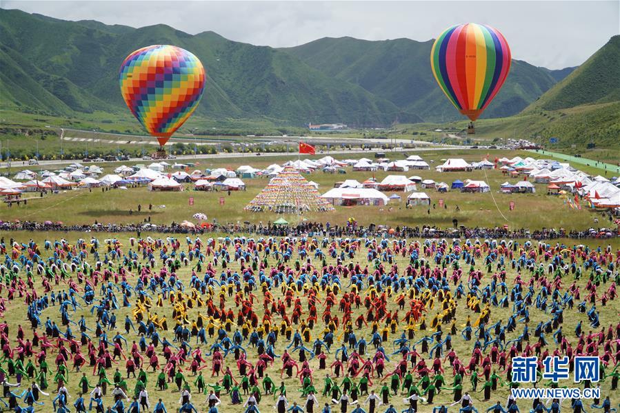 8月12日,身著節(jié)日盛裝的演員和當(dāng)?shù)厝罕娫谙臐蔀┎菰咸疱伹f舞。新華社記者 黃澤民 攝