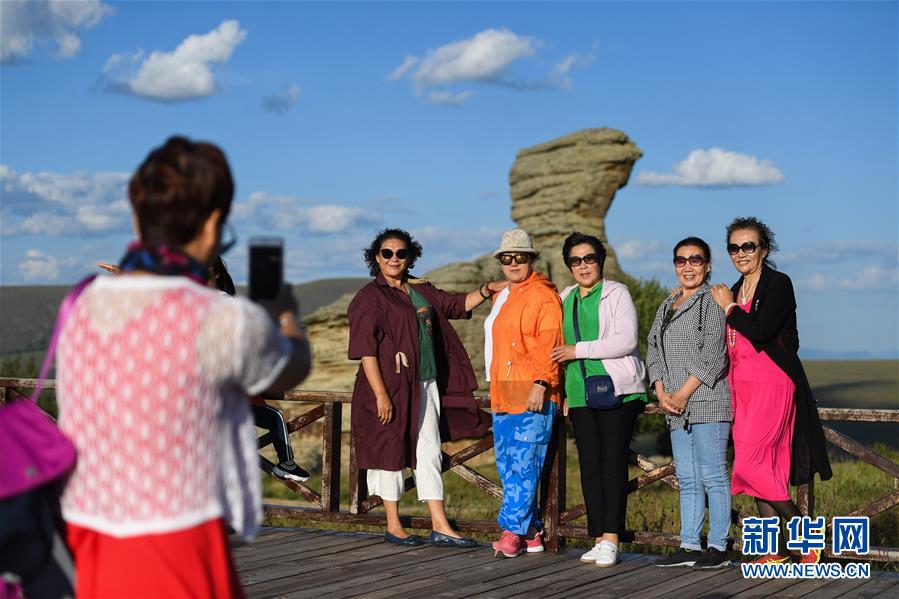 游客在克什克騰石陣景區(qū)拍照留影(8月11日攝)??耸部蓑v旗位于內(nèi)蒙古自治區(qū)赤峰市西北部,境內(nèi)的湖泊、河流、草原、森林等自然景觀,讓人們流連忘返。新華社記者劉磊攝