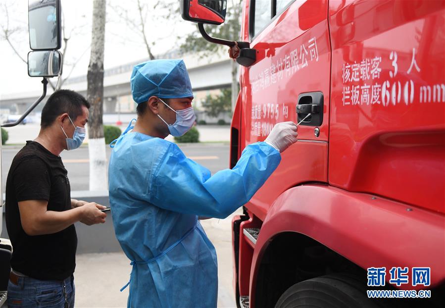 工作人員在新發(fā)地批發(fā)市場周轉(zhuǎn)新區(qū)對(duì)進(jìn)場車輛進(jìn)行取樣(8月6日攝)。 新華社記者 張晨霖 攝