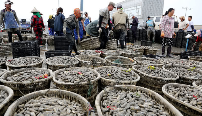 2019年7月9日,漁民們在江蘇連云港沿海地區(qū)海邊的灘涂上將剛收獲的海蟶運(yùn)送上岸裝箱外運(yùn)。