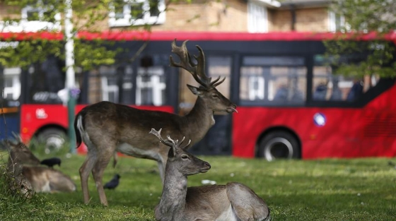 倫敦東部一個居民區(qū)附近公園里原來散養(yǎng)的鹿紛紛從公園走出來,或吃草或接受附近居民的喂食,成為特殊時期居民區(qū)里的新“客人”。