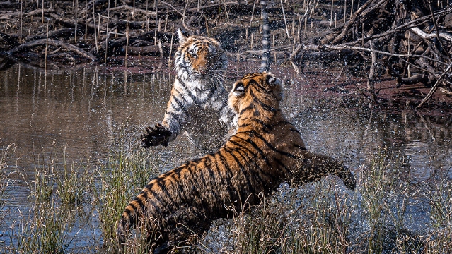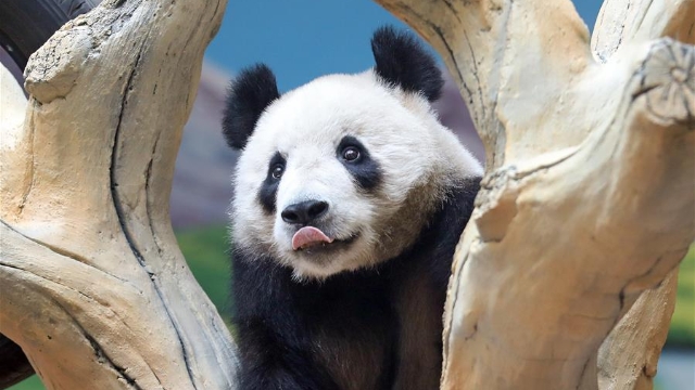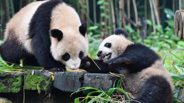 正在享受竹子大餐的廣州長隆野生動(dòng)物世界大熊貓婷仔被大熊貓隆仔搶食,兩只大熊貓上演一場(chǎng)爭食戲碼。