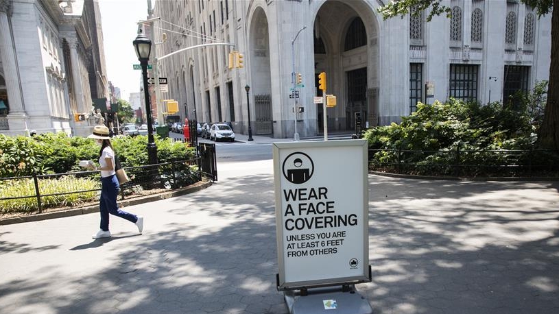 7月6日,行人走過美國紐約一處公園內(nèi)的提示牌,上面寫有防疫須知和公園管理規(guī)定。